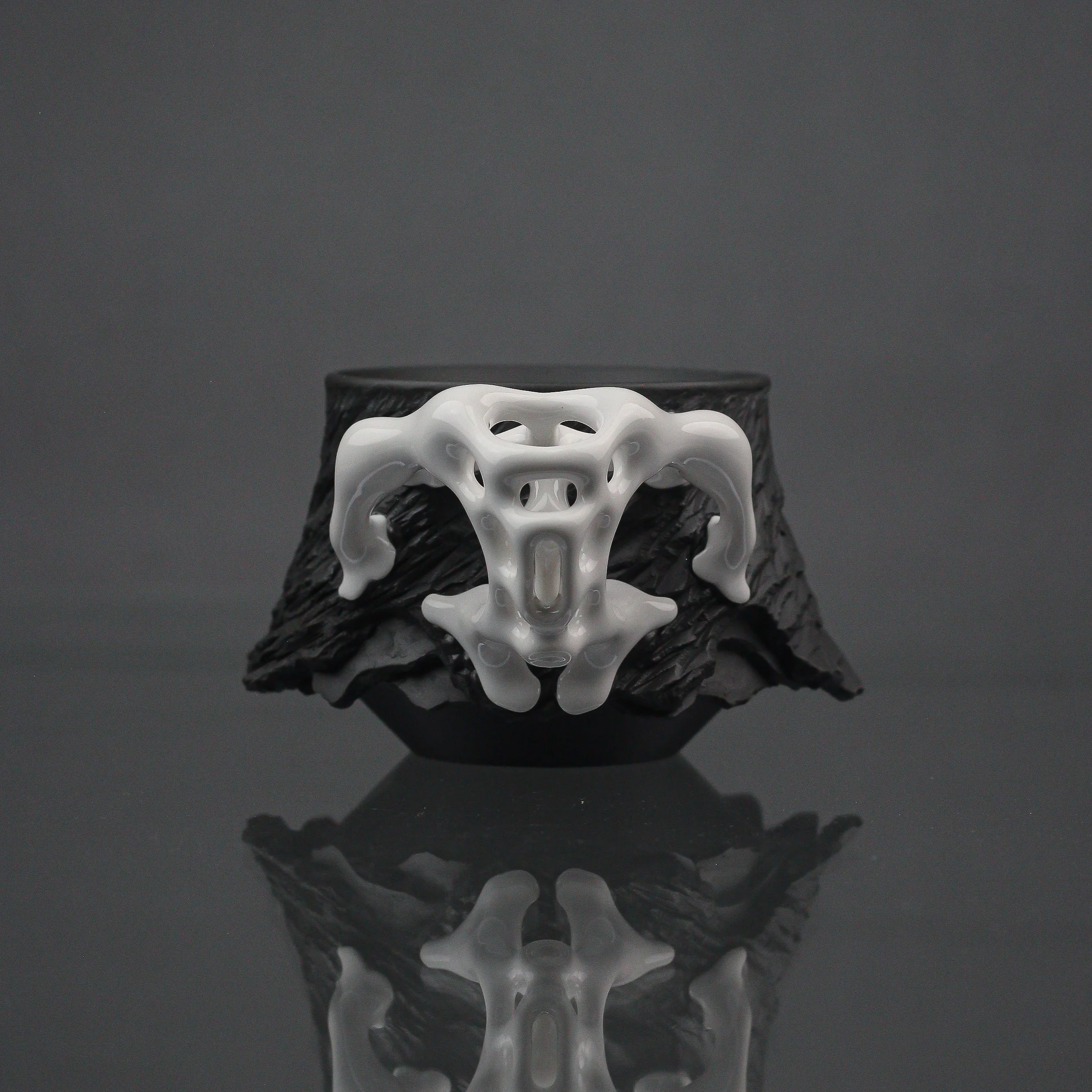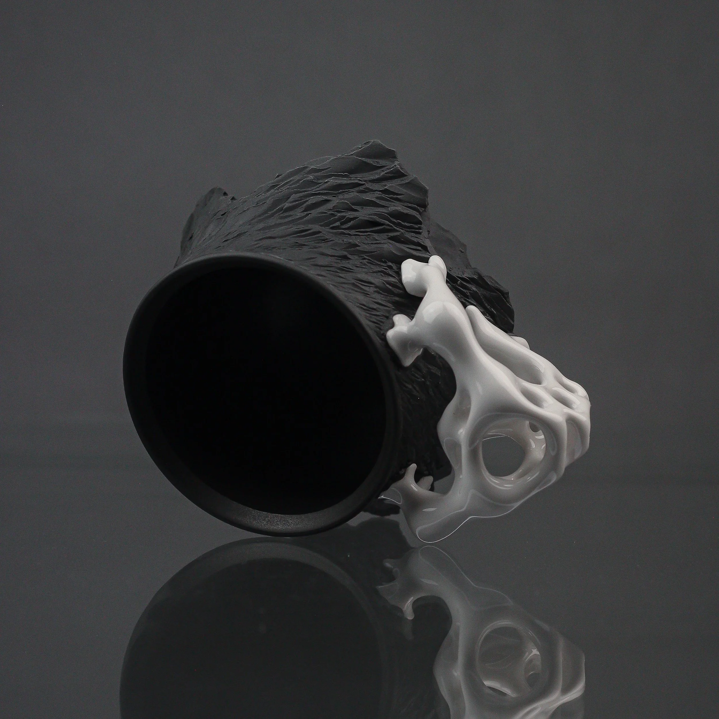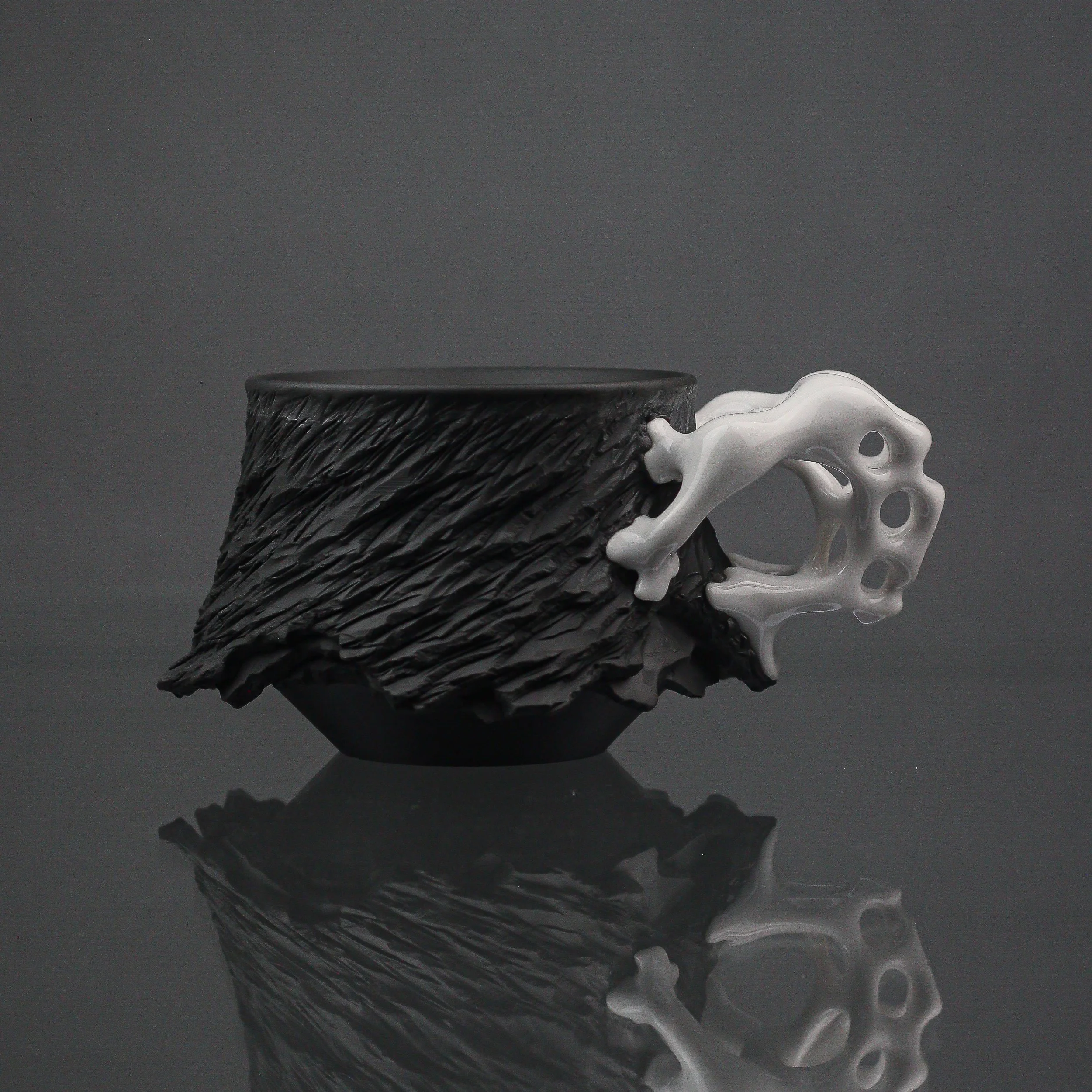 Wheel-thrown from black porcelain, the exterior is left unglazed to highlight its raw, rock-like texture. The chattering technique creates organic patterns across the surface, while the base reveals layered details that mimic the natural split of stone.
