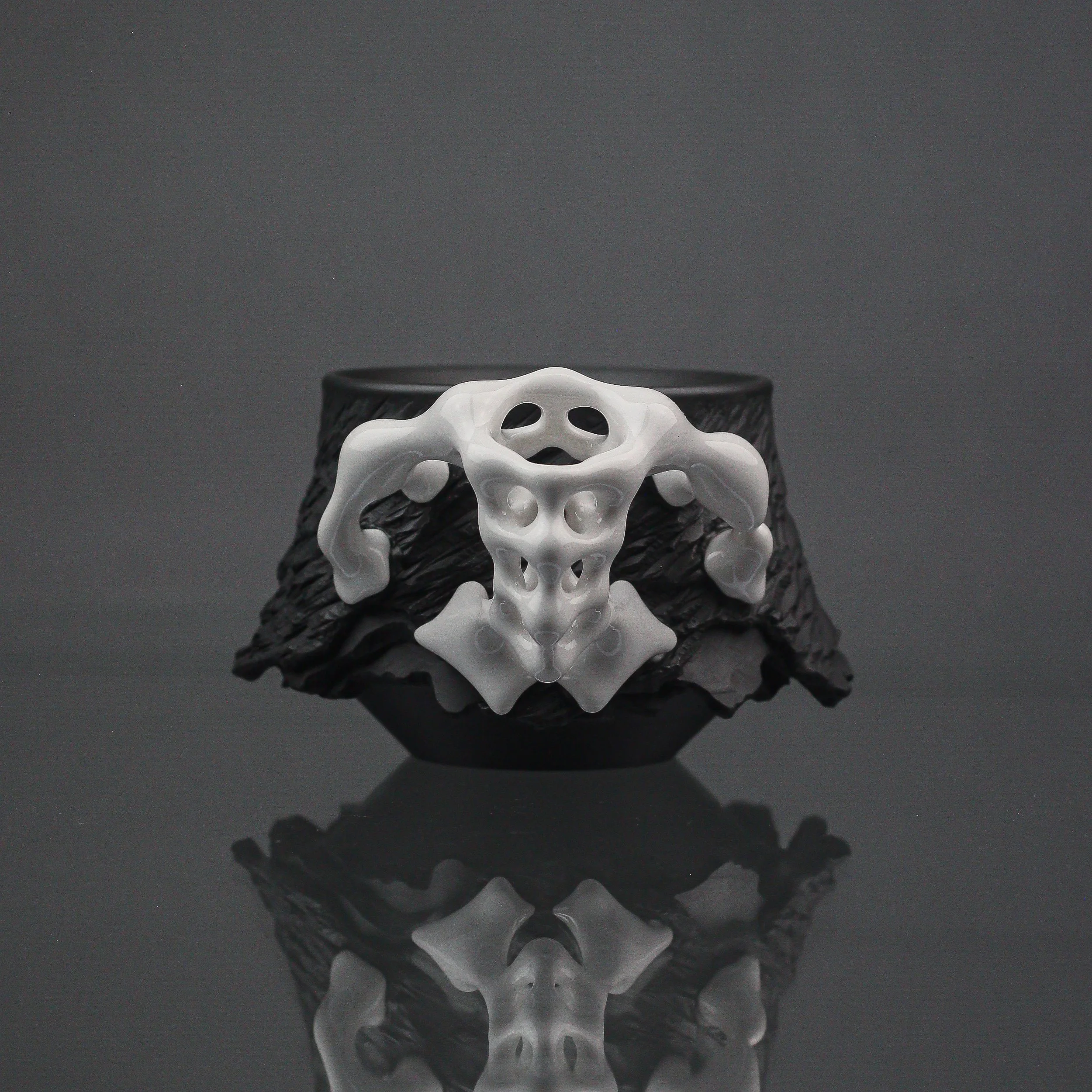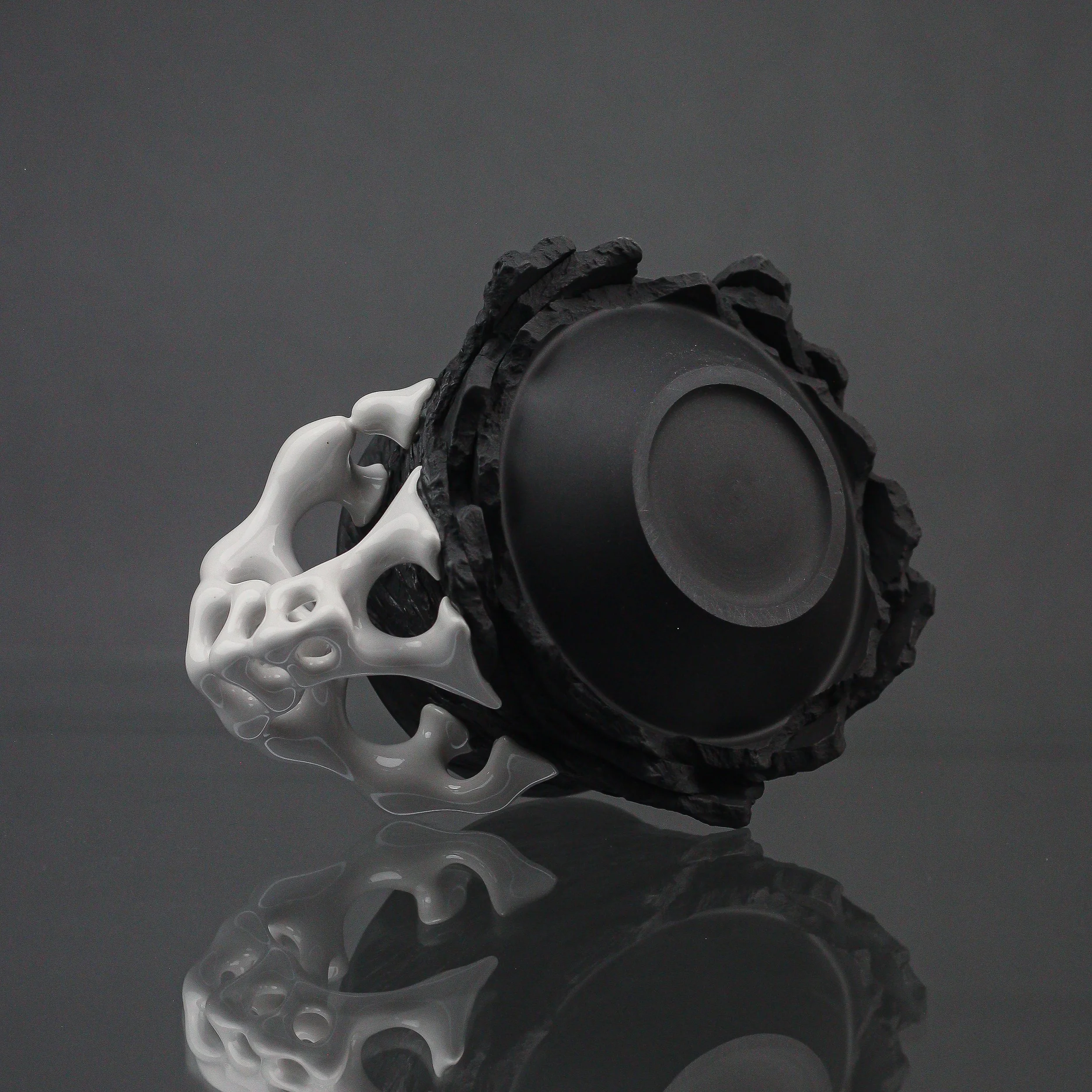 Wheel-thrown from black porcelain, the exterior is left unglazed to highlight its raw, rock-like texture. The chattering technique creates organic patterns across the surface, while the base reveals layered details that mimic the natural split of stone.