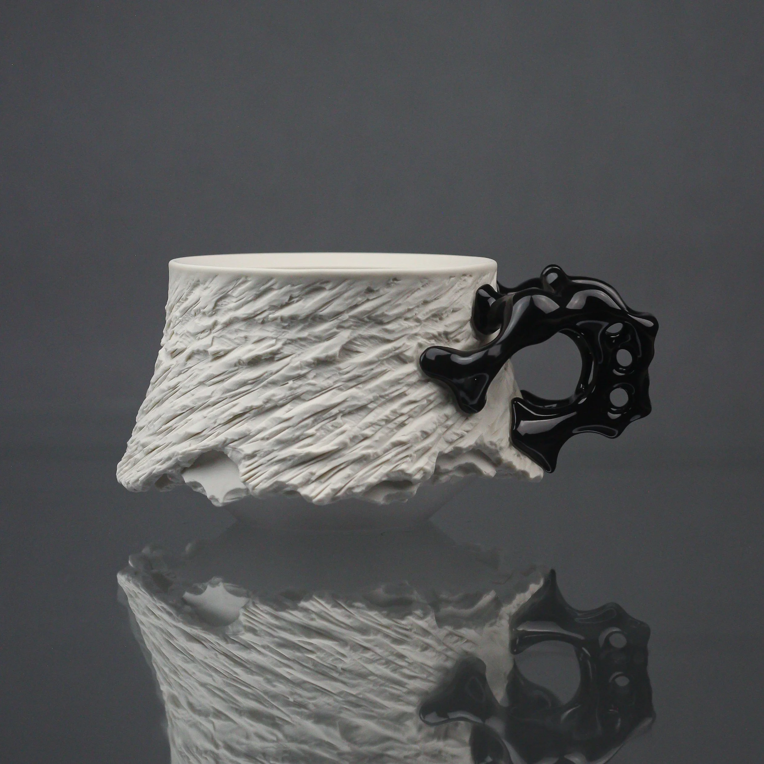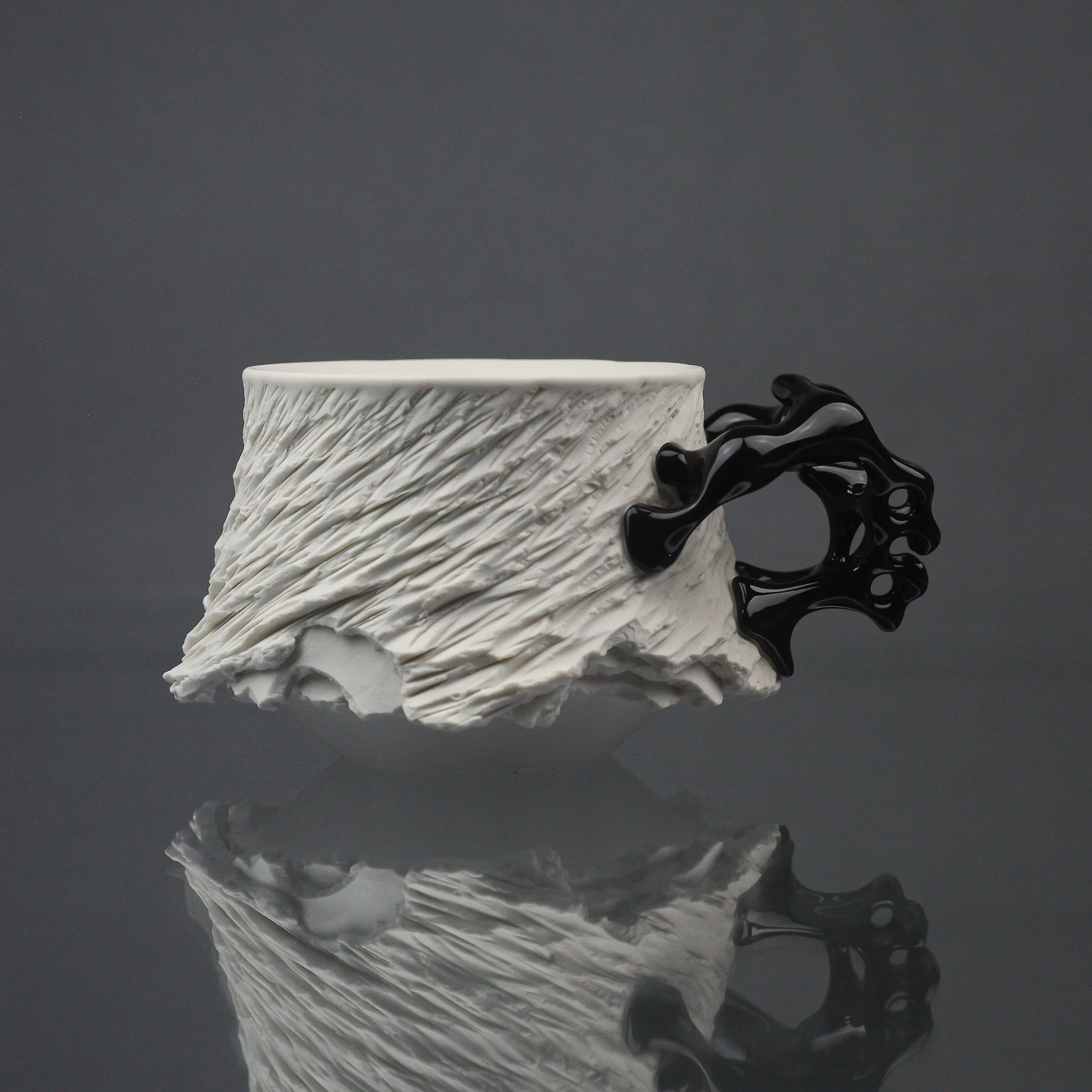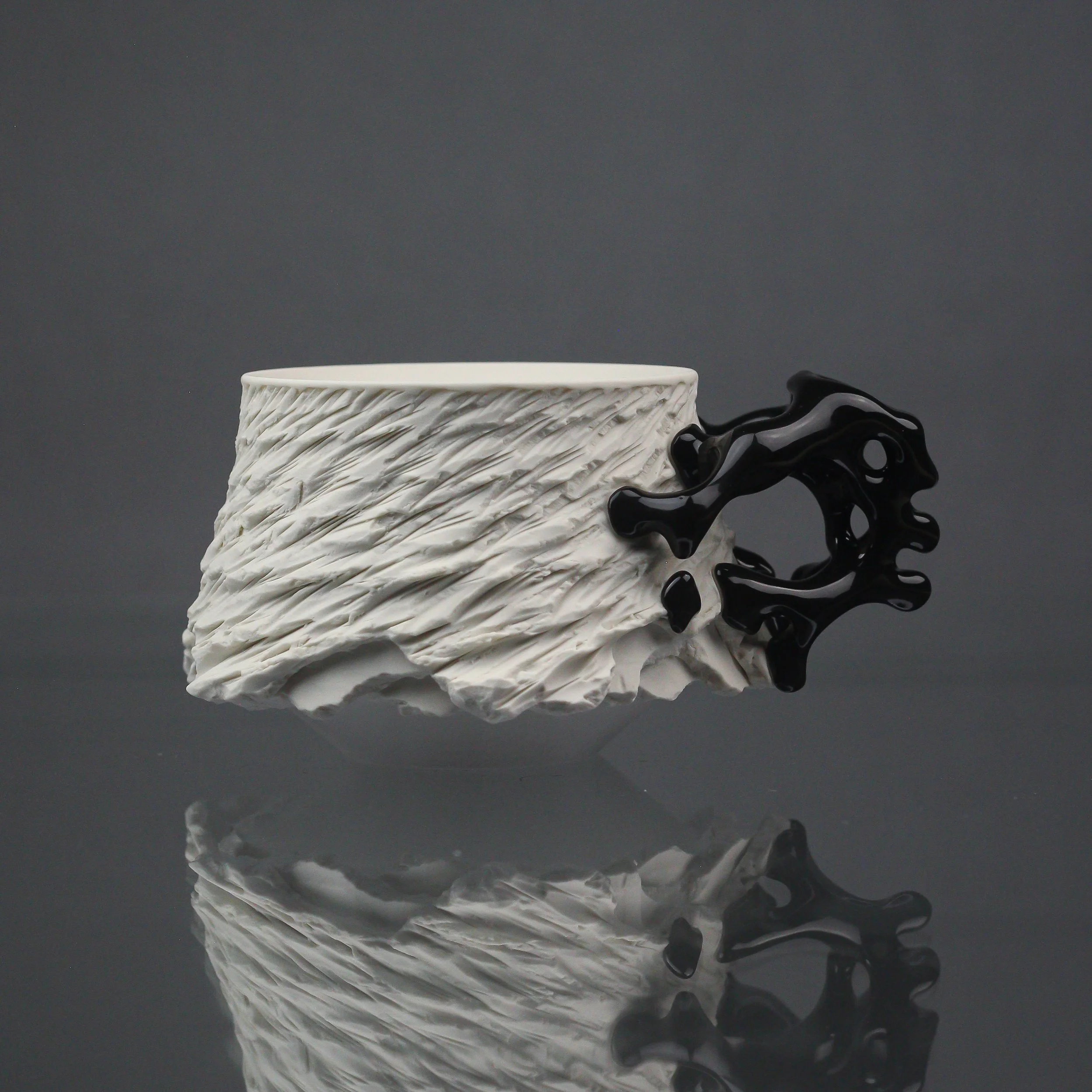 The handle is its opposite—smooth, glossy, and deep black. Carved by hand from a single block of porcelain, it takes shape around my hand, feeling almost like liquid against the raw exterior.