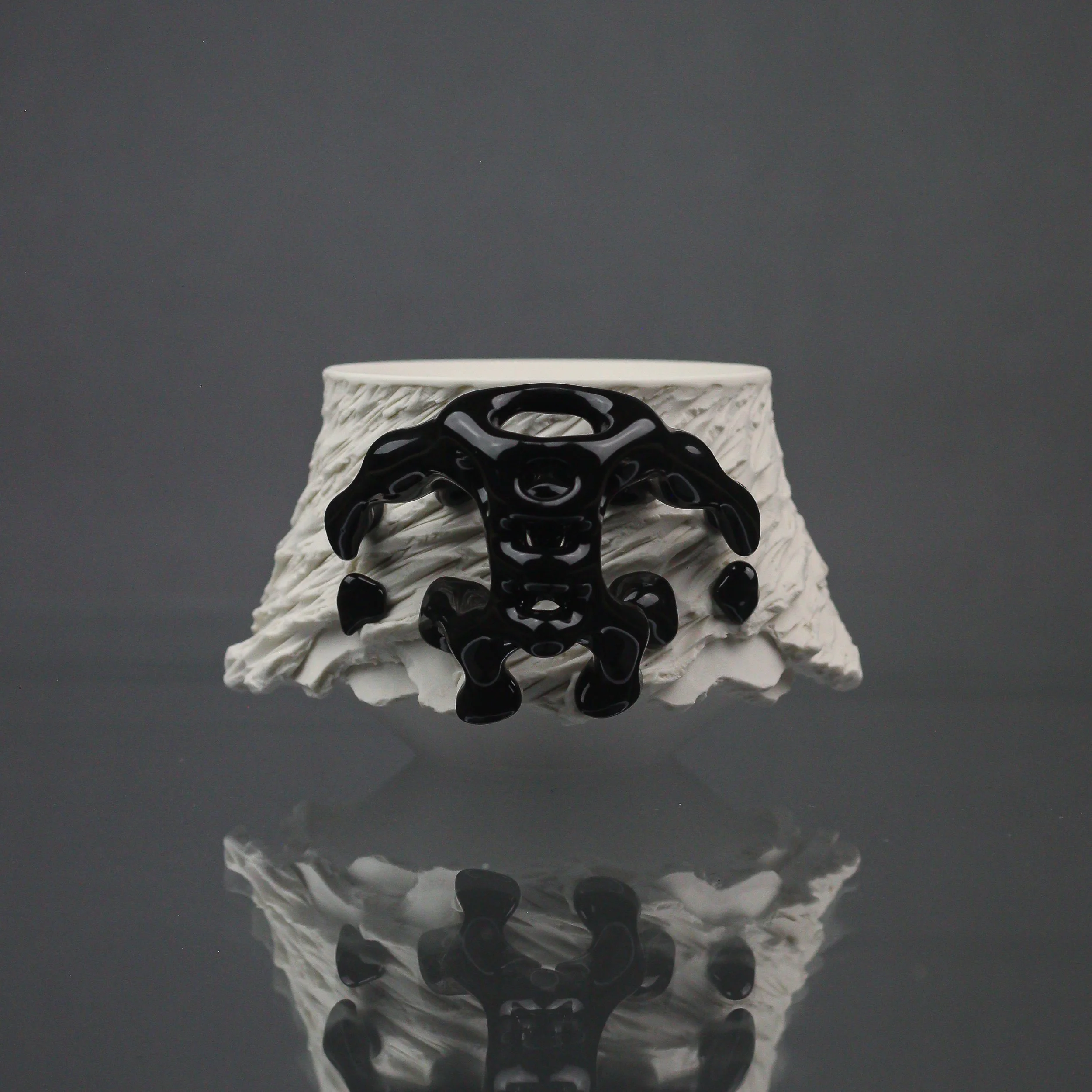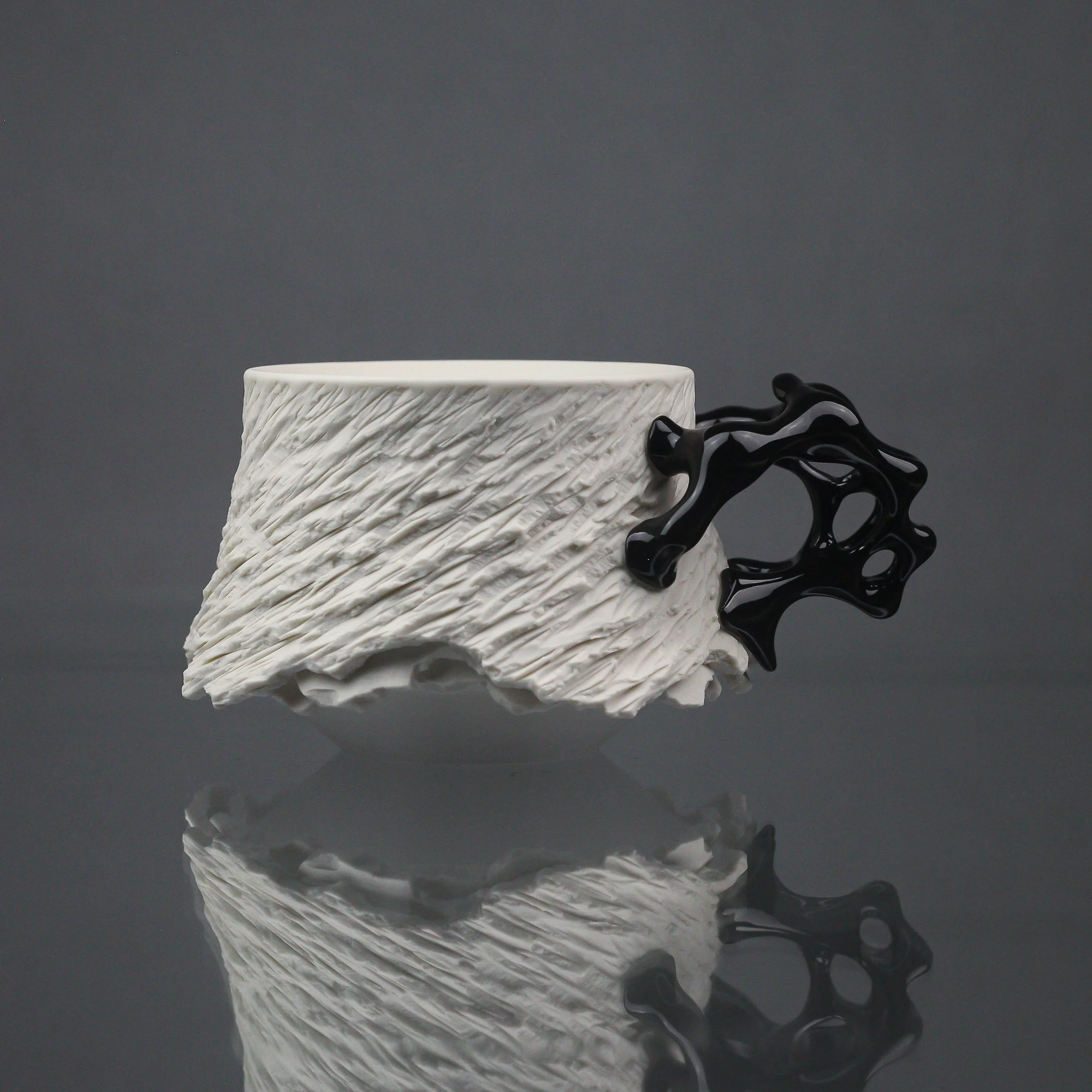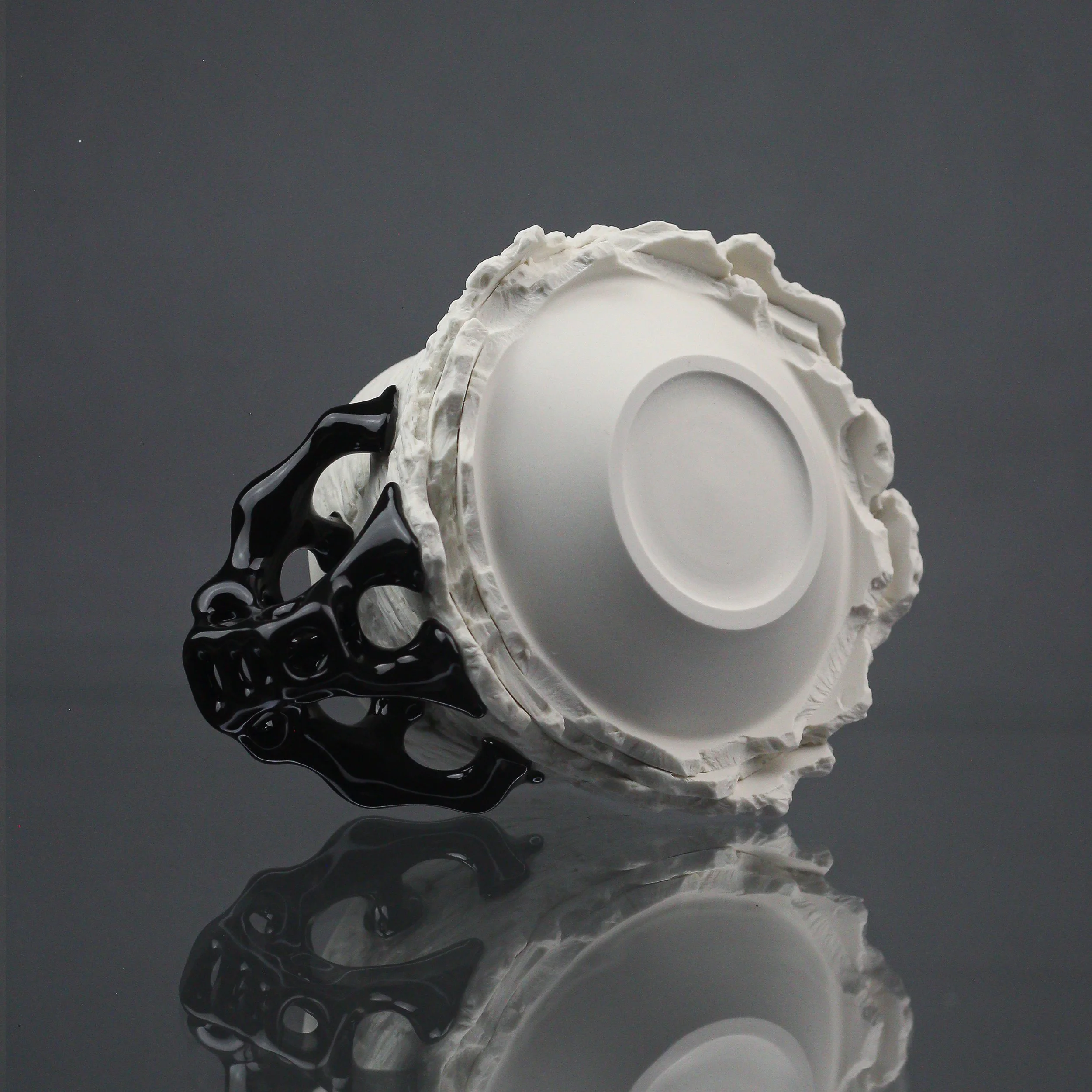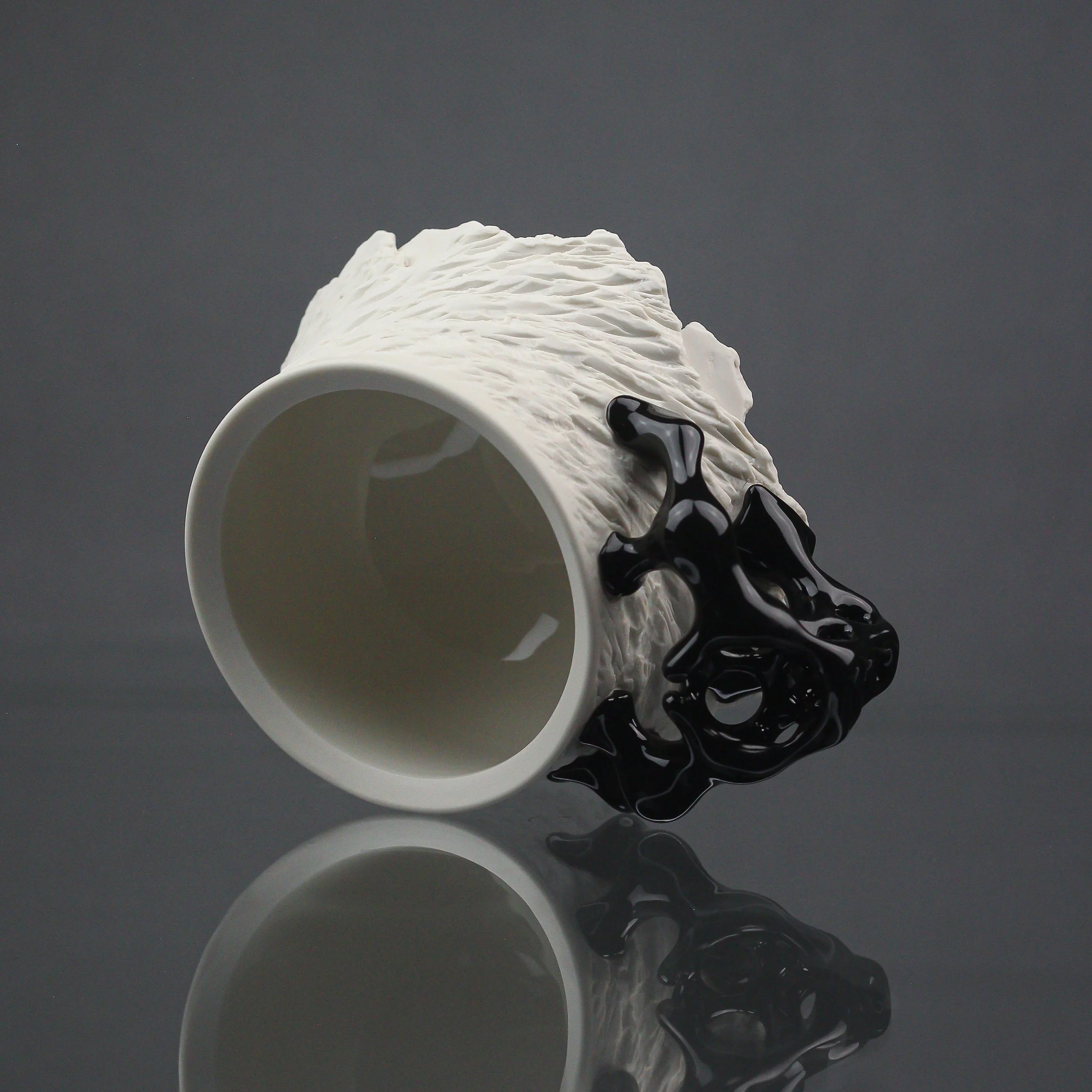 The handle is its opposite—smooth, glossy, and deep black. Carved by hand from a single block of porcelain, it takes shape around my hand, feeling almost like liquid against the raw exterior.