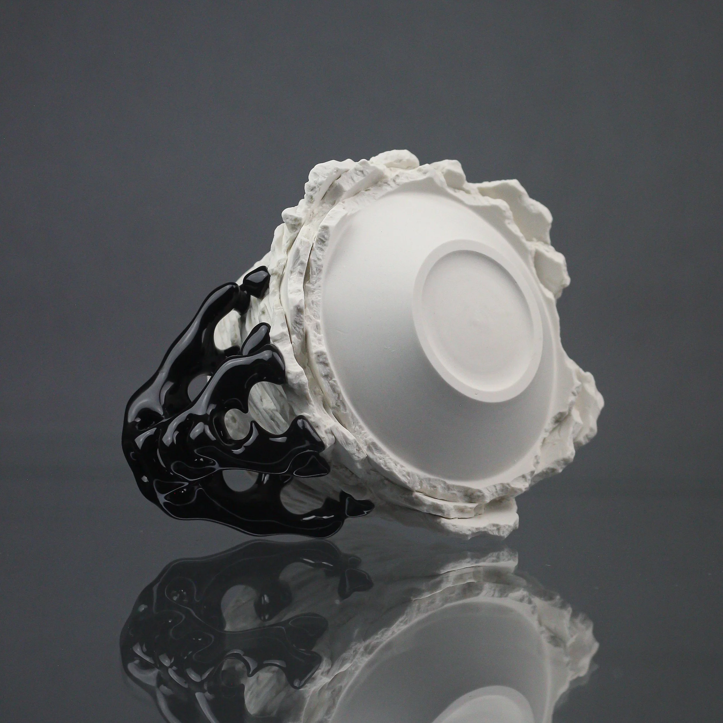 Wheel-thrown from white porcelain, the exterior is left unglazed to highlight its raw, stone-like texture. The chattering technique creates organic patterns across the surface, while the base reveals layered details that mimic the natural split of stone.
